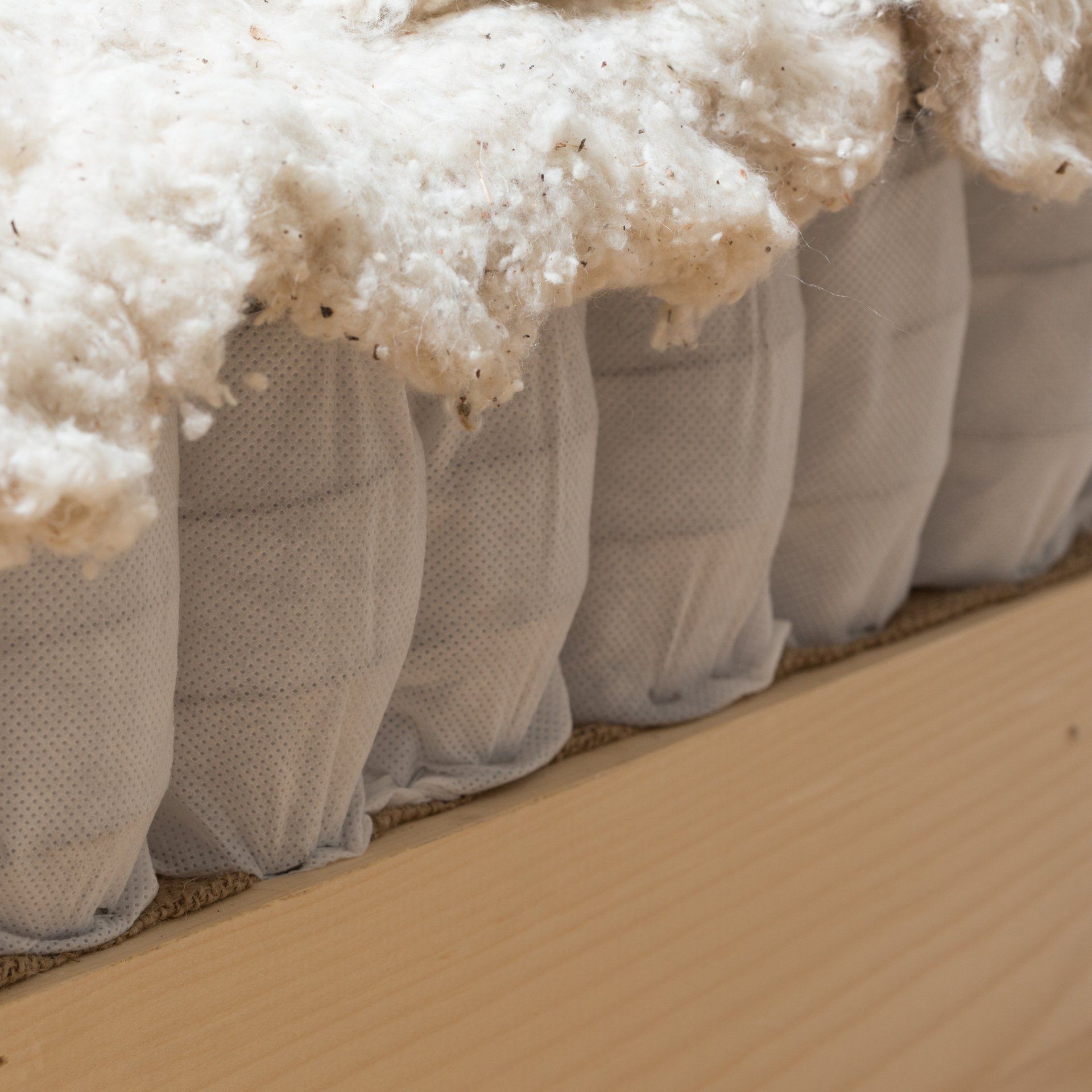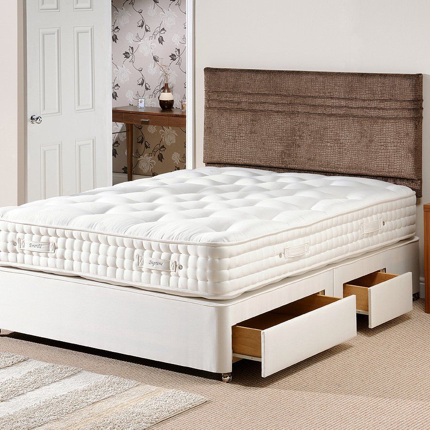 Our most popular beds are the hand-crafted models made for us by “Old English” craftsmen and the pick of the bunch has to be the Emerald Supreme. Each divan set is made to exacting standards using the finest materials to create a sumptuous product. The 5′ mattress has a traditional hair pad over the 1400 pocket springs. Horse hair was always used historically as it was so resilient. Then there is a layer of wool and two layers of a Pure new wool, silk and cashmere mix along with two layers of poly cotton. The natural fibres allow the bed to “breath” and offer warmth in winter and yet are still cool in summer, unlike a lot of beds which use man-made fibres which can be a bit “sweaty”. All hand made with each individual spring nested in its own cloth pocket for maximum support and comfort. The mattresses are then hand side-stitched for maximum support and the bases also have their own pocket springs.